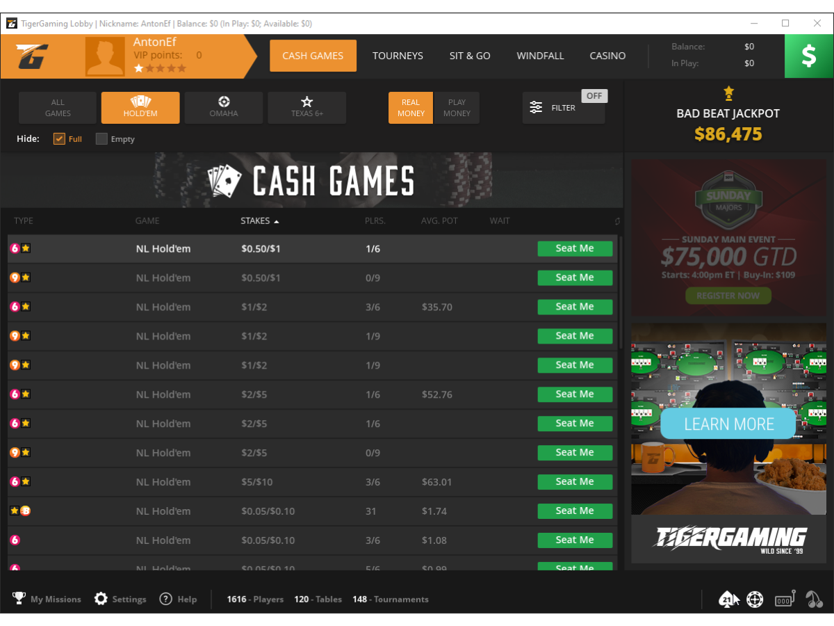 Больше всего игры – за кэш-столами по правилам безлимитного Холдема, преимущественно на низких лимитах (минимальный лимит – NL2). Хотя в пиковое время собираются игроки и за самыми дорогими столами – вплоть до NL5000. Есть, как обычные кэш-столы, так и столы с бэд-бит джекпотом, за которыми собирается повышенный рейк на формирование призового фонда джекпота. В покер-румах сети Winning Poker Network пользуется популярностью пот-лимитная Омаха. Любители турниров не сильно обрадует турнирная сетка WPN, хотя тут и есть несколько регулярных событий, а также серия с гарантией в 1 млн долларов.