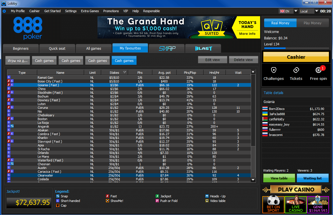 Как уже упоминалось ранее, софт 888poker признавался самым лучшим среди всех покер-румов. В оформлении лобби преобладают темные цвета, на фоне которых отчетливо видны синие и белые надписи. Большое количество фильтров позволяет находить нужные столы и турниры по различным параметрам. Интуитивно понятный интерфейс не вызовет сложностей даже у начинающих покеристов.