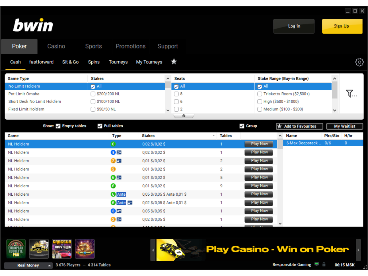 6-макс столы по Техасскому Холдему в Bwin являются наиболее популярными. В пик в лобби можно увидеть до 100 столов микролимитов (до NL10), 20 столов NL25, 15 столов NL50, 10-15 столов на каждом из лимитов NL100 и NL200, еще столов 10 на лимитах выше. Игра на самых высоких лимитах — нерегулярная, собираются столы вплоть до NL5000, причем даже днем бывают столы на NL1K-2K.