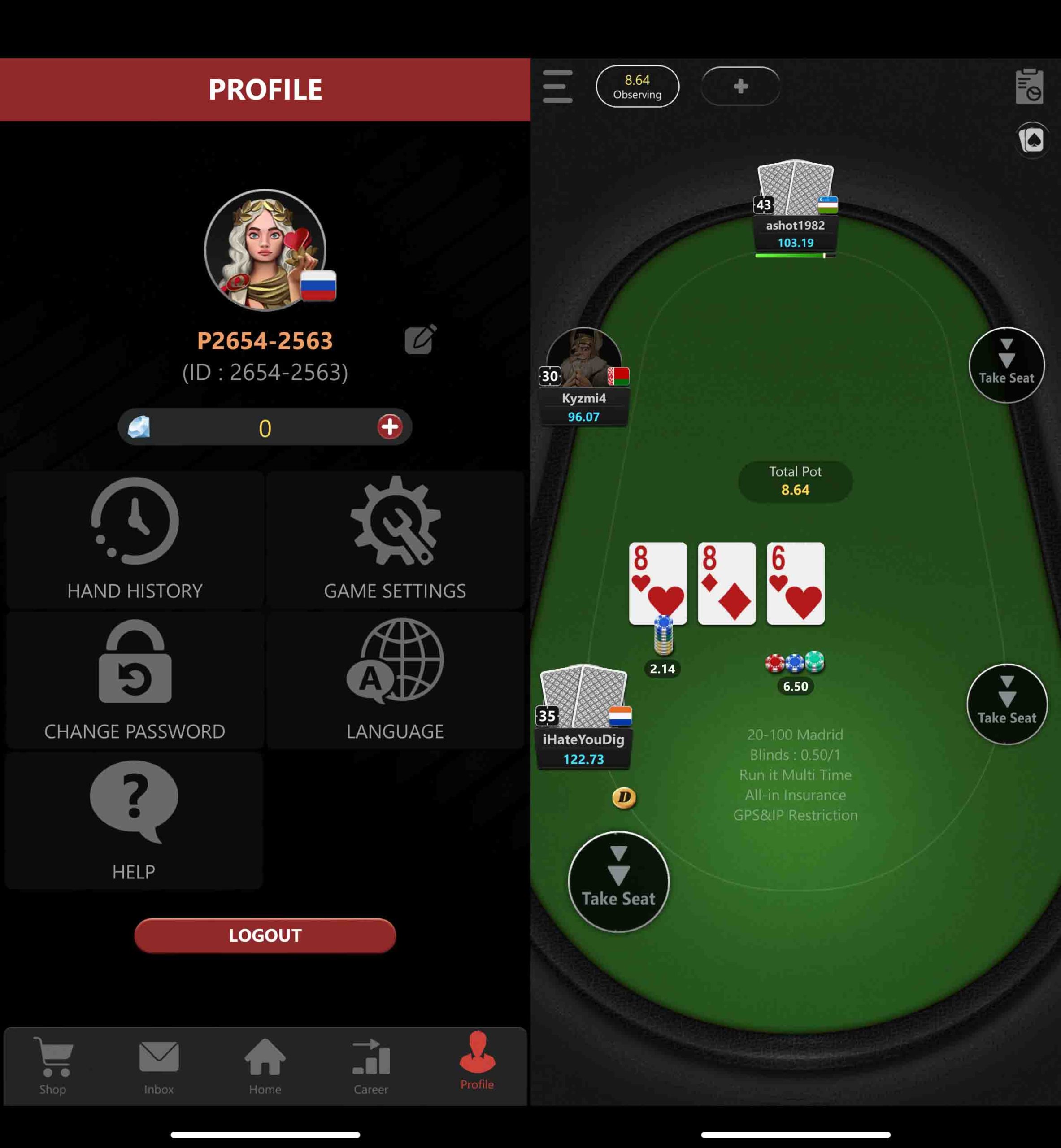 - Profile – профиль игрока, здесь же можно посмотреть историю раздач.