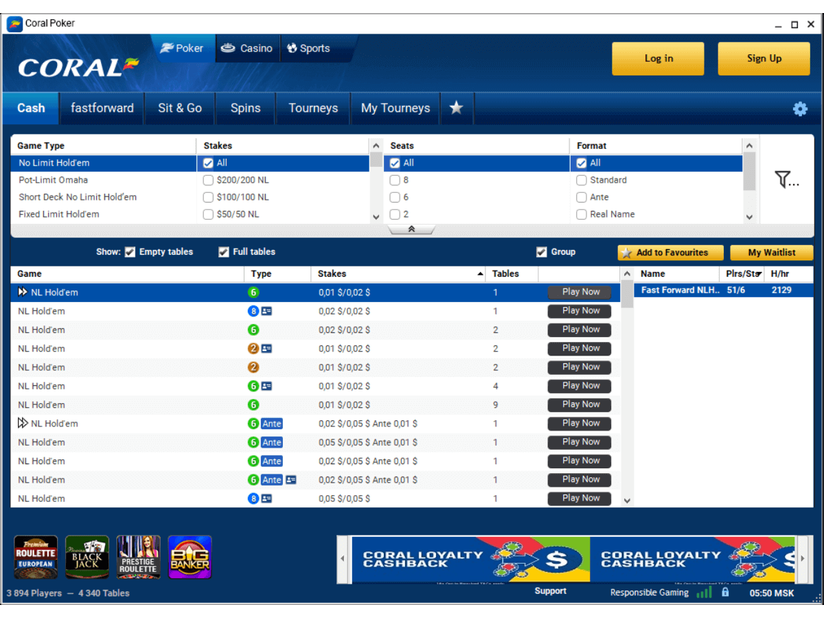 Как и в большинстве других румов, кеш-трафик сосредоточен на 6-макс столах по Холдему. 9-макс столы собираются обычно только в пиковое время и не более одного-двух на лимит.