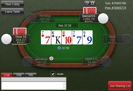 Количество подключений 150-200. В Холдеме играются HU, 6-макс и 8-макс столы причем последние самые популярные. Играются лимиты NL1/2-NL15/30 (NL50-NL1K). Всего около 10 столов, и еще на таком же количестве столов игроки ожидают оппонентов за HU столами. Обычно самая дорогая игра идет именно за ними. На еще более высоких лимитах столы могут появляться изредка.