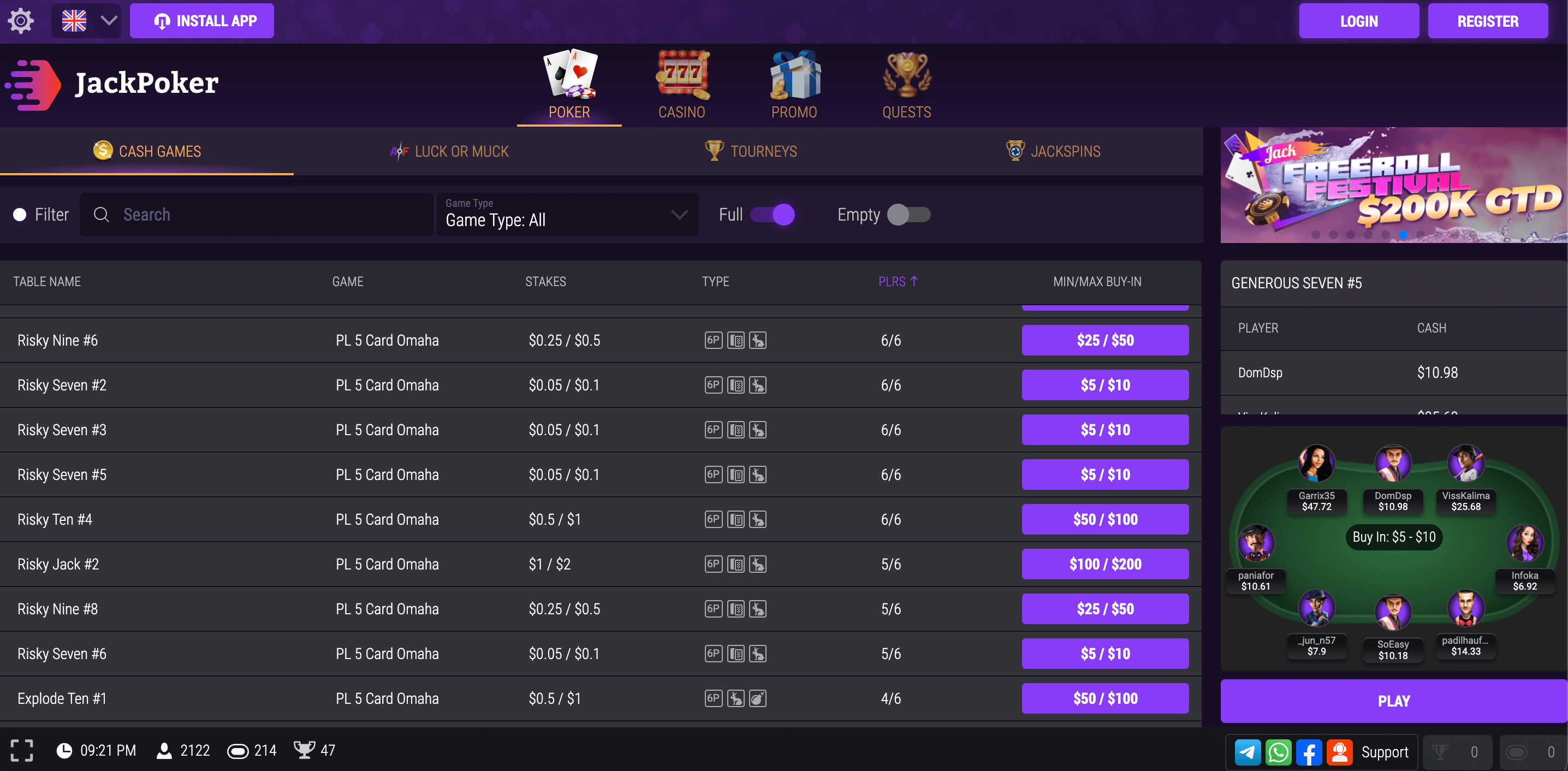 В покер-руме проходит много игр по правилам Безлимитного Холдема и потлимитной Омахи с 4 и 5 картами. Кеш-столы можно найти со ставками от 5/10 центов до 10/20 долларов.