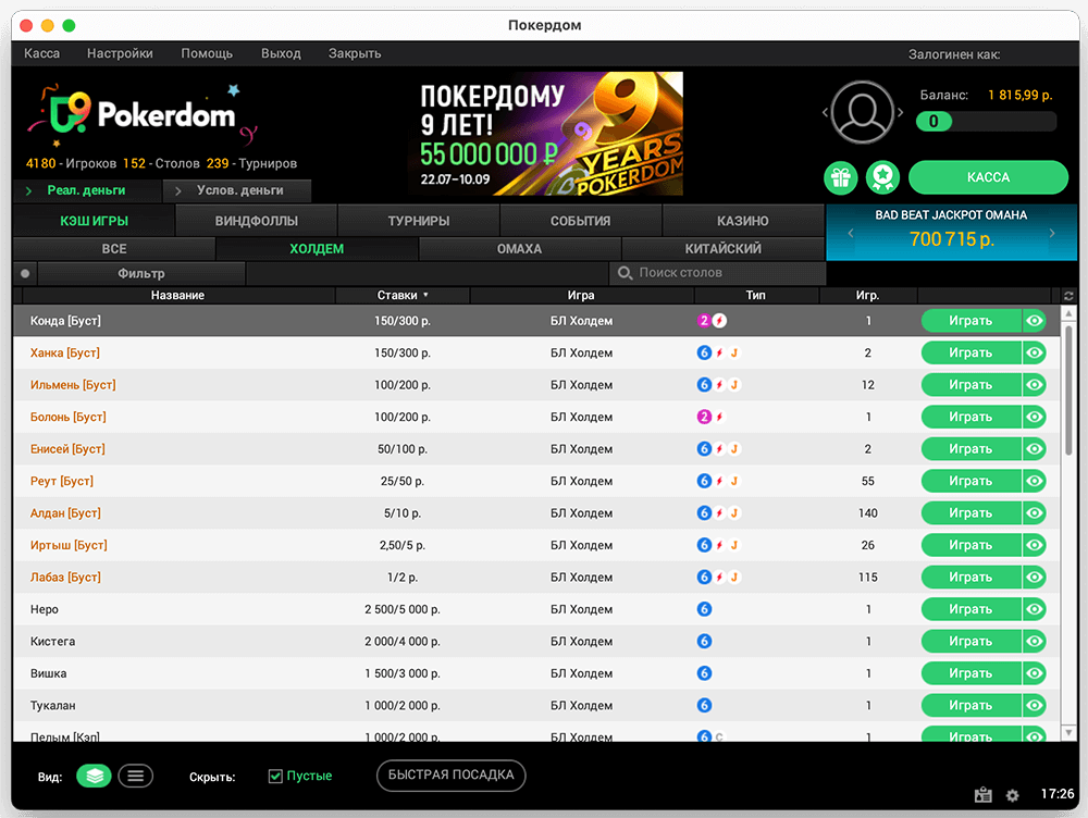 В Покердоме довольно большое разнообразие покерных дисциплин и форматов. Кэш-игры представлены 6- и 8-макс столами по правилам Холдема и Омахи. Большая часть любителей кэша играют в Быстрый покер (формат, в котором после фолда вы автоматически перемещаетесь за другой стол). Омаха представлена только пятикарточной и шестикарточной разновидностями.