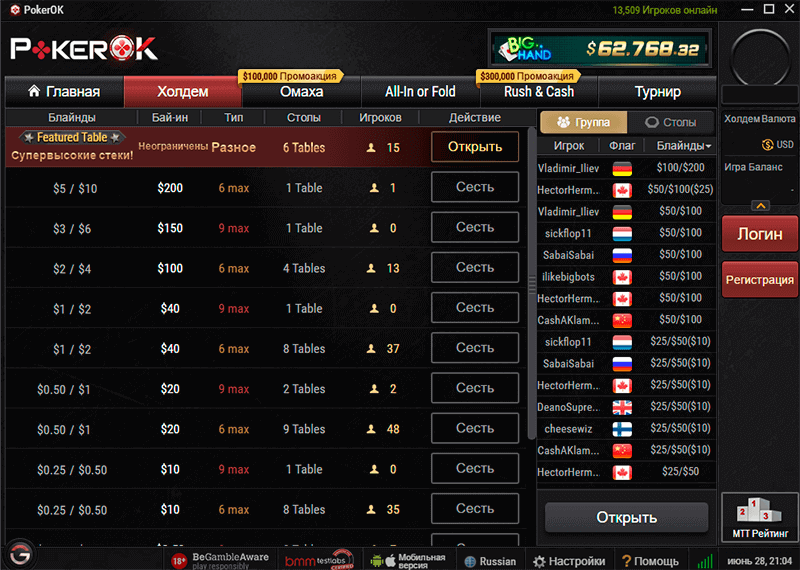ПокерОК получил широкое распространение и среди русскоязычных покеристов, которые по достоинству оценили качественный перевод сайта, оперативную работу русскоязычного саппорта и поддержку многих платежных систем, используемых в странах СНГ. Определенно рум обладает всеми характеристиками и преимуществами, необходимыми для того, чтобы стать флагманом в сети GG.