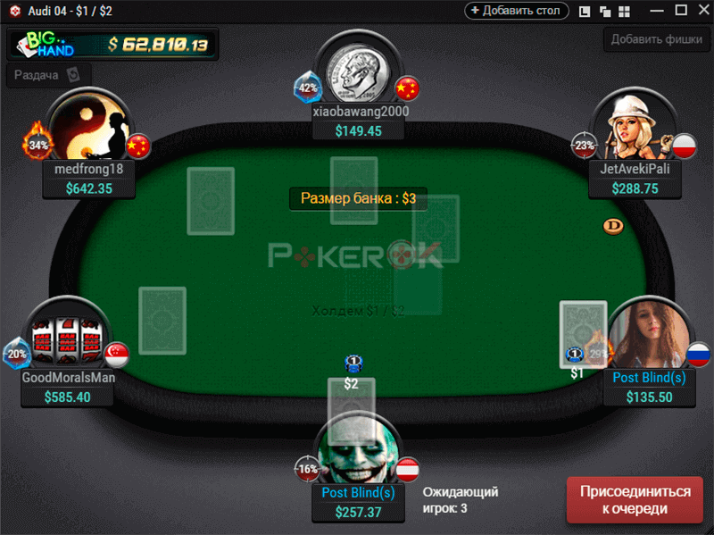 Особое внимание в PokerOK уделяется хайроллерам, для которых здесь регулярно проводят дорогие турниры. В этой комнате любители дорогих игр найдут события с бай-инами от 500 долларов. Даже турниры, стоимостью в 25.000 долларов и выше, собирают достаточно большое количество участников.