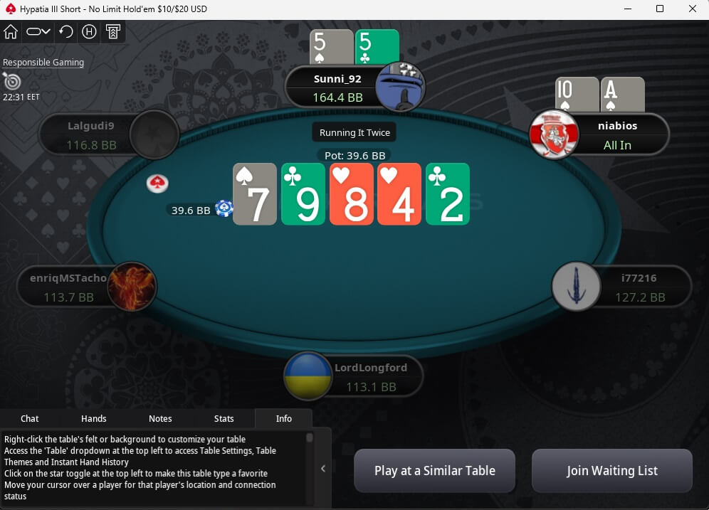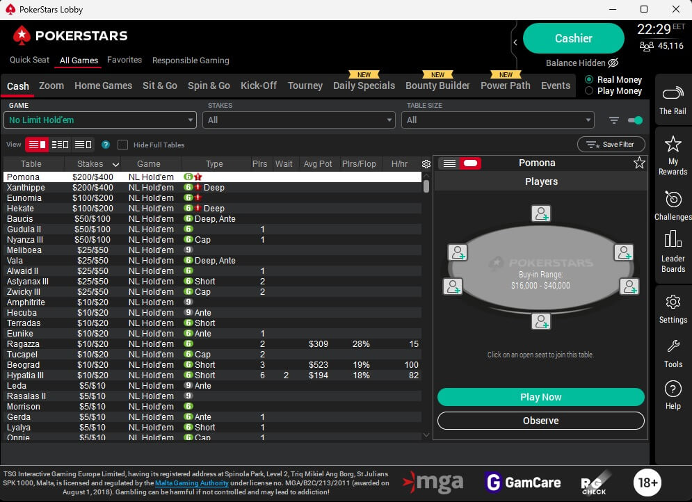 Быстрый покер в PokerStars представлен как Холдемом, так и Омахой. Можно сыграть за 6-макс столами, а также хедз-ап. Доступны столы с кэпом.