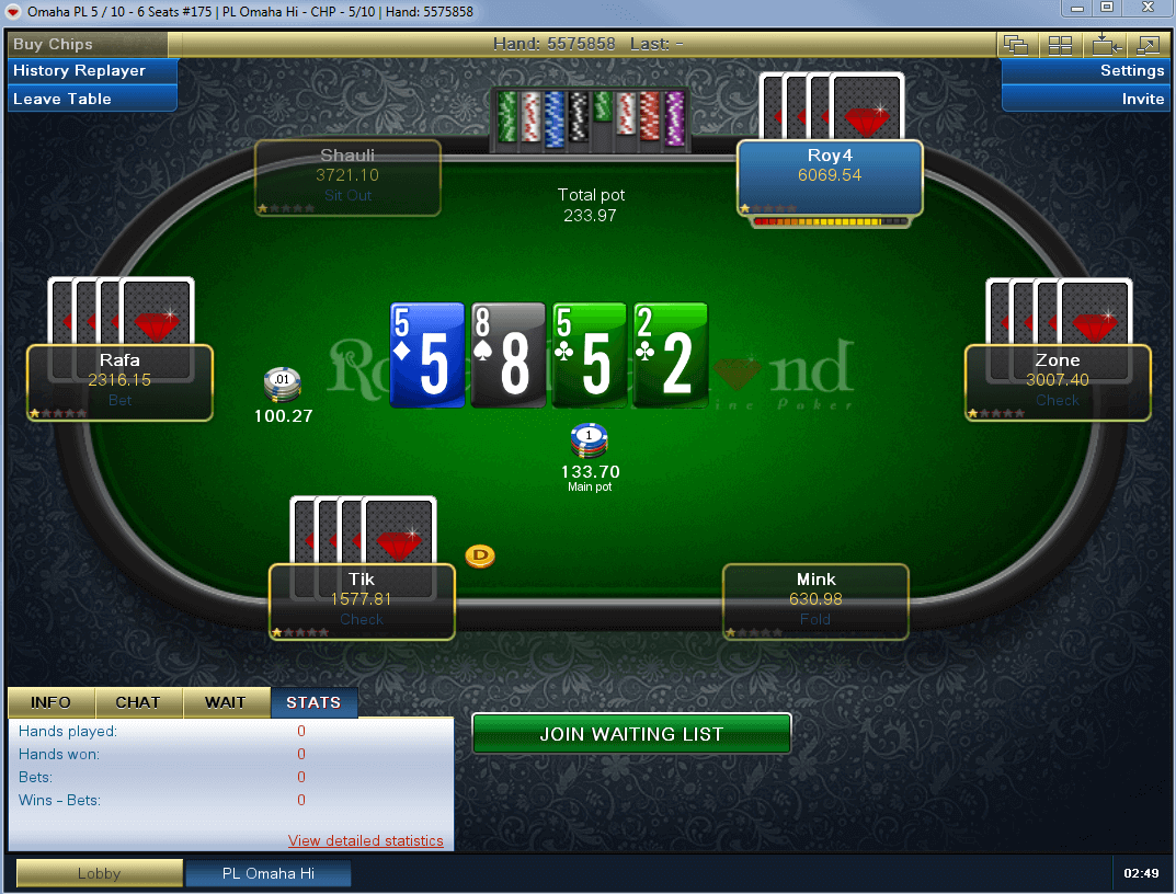 Особой популярностью здесь пользуется потлимитная Омаха, которая тоже представлена двумя форматами столов – 6-макс и хэдз-ап. Лимиты 6-макс столов варьируется в диапазоне от 0.25/0.50 до 15/30 долларов, хедз-ап — от 0.50/1.00 до 3/6 долларов. Здесь есть столы, как с глубокими стеками (минимум 100 ББ, максимум 500 ББ), так и регулярные столы, за которые можно сесть минимум с 20 ББ.