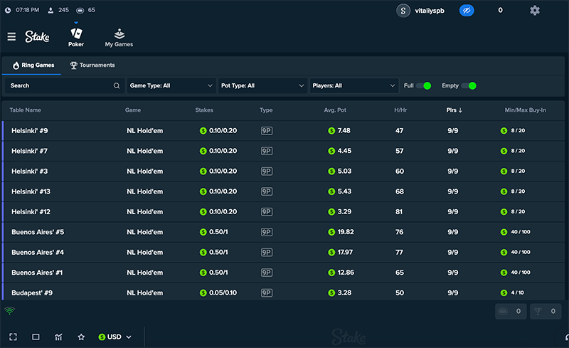 В Stake Poker вы найдете кэш-столы с блайндами от 1/2 центов до 0.5/1 долларов. Минимальный и максимальный бай-ины зависят от лимита, и могут варьироваться в пределах от 40 ББ до 100 ББ. Основной трафик рума сконцентрирован преимущественно за кэш-столами. Так что на всех лимитах игра есть круглосуточно. Игры проходят за 9-макс столами по правилам безлимитного Холдема и потлимитной Омахи.