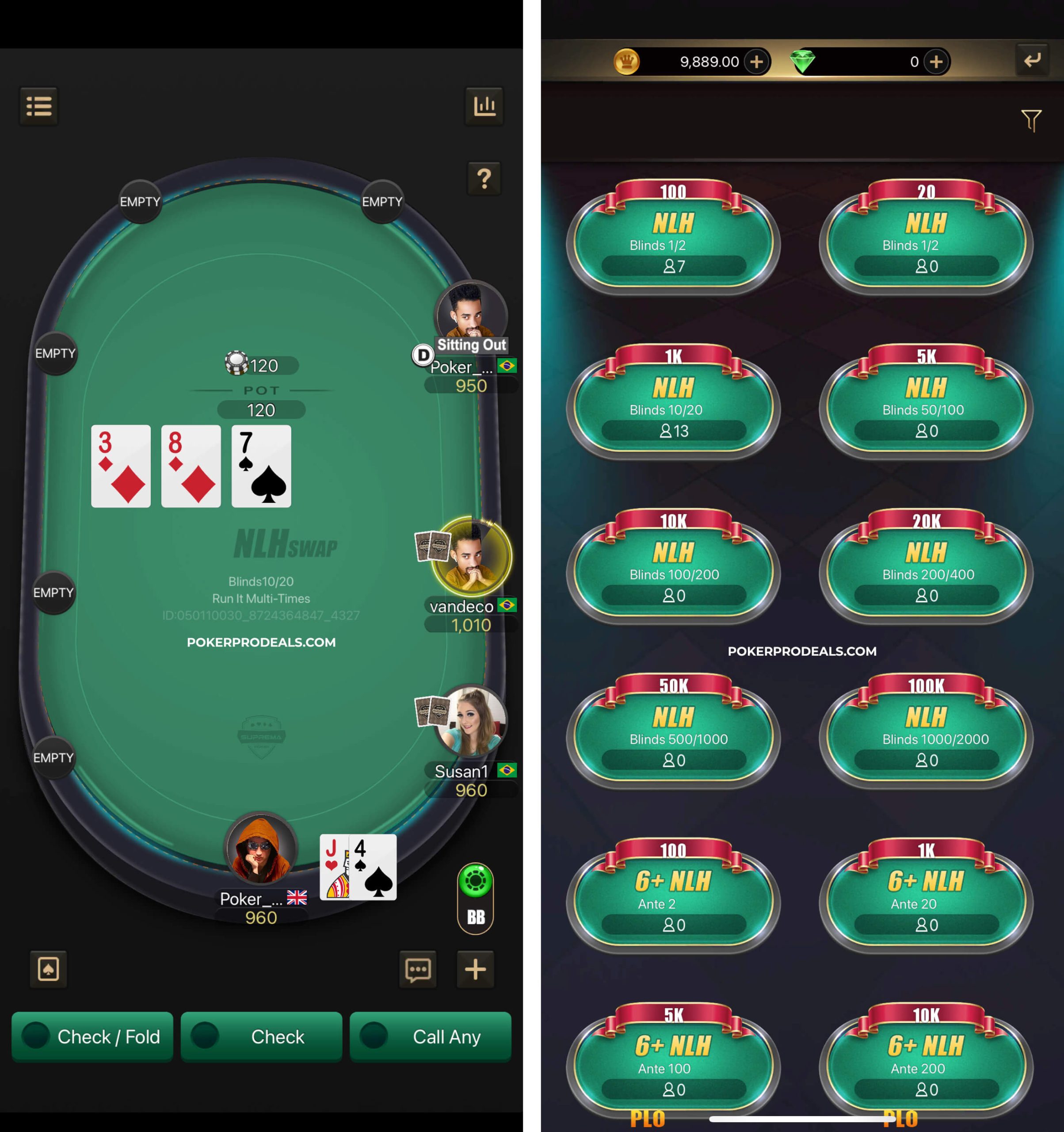 - Безлимитный Холдем в формате 6-макс, 8-макс и хедз-ап с лимитами от 2/4 центов до 9/18 долларов. Стоит отметить, что лимиты в приложении указываются в местной валюте – бразильских реалах.